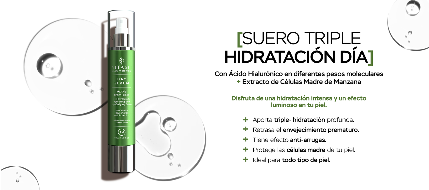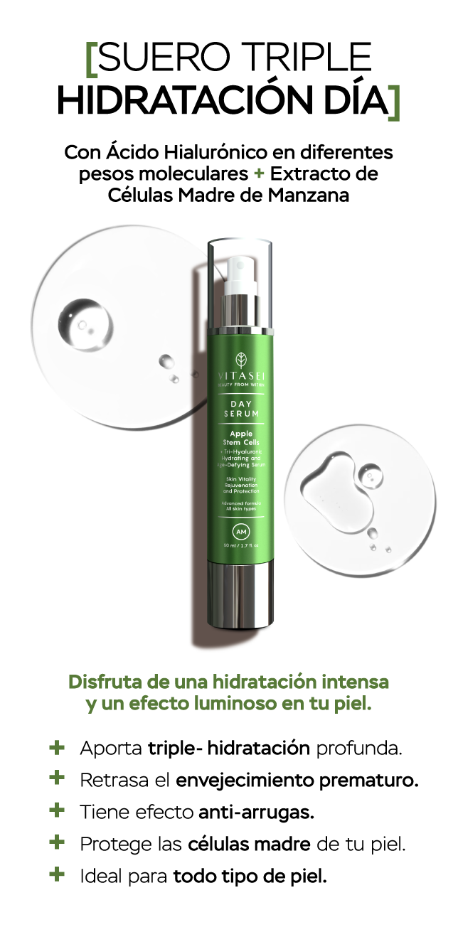 El ácido hialurónico ayuda a llevar agua a las células de la piel. Estas células saturadas de humedad contribuyen a que tu piel luzca más firme, tensa y juvenil.