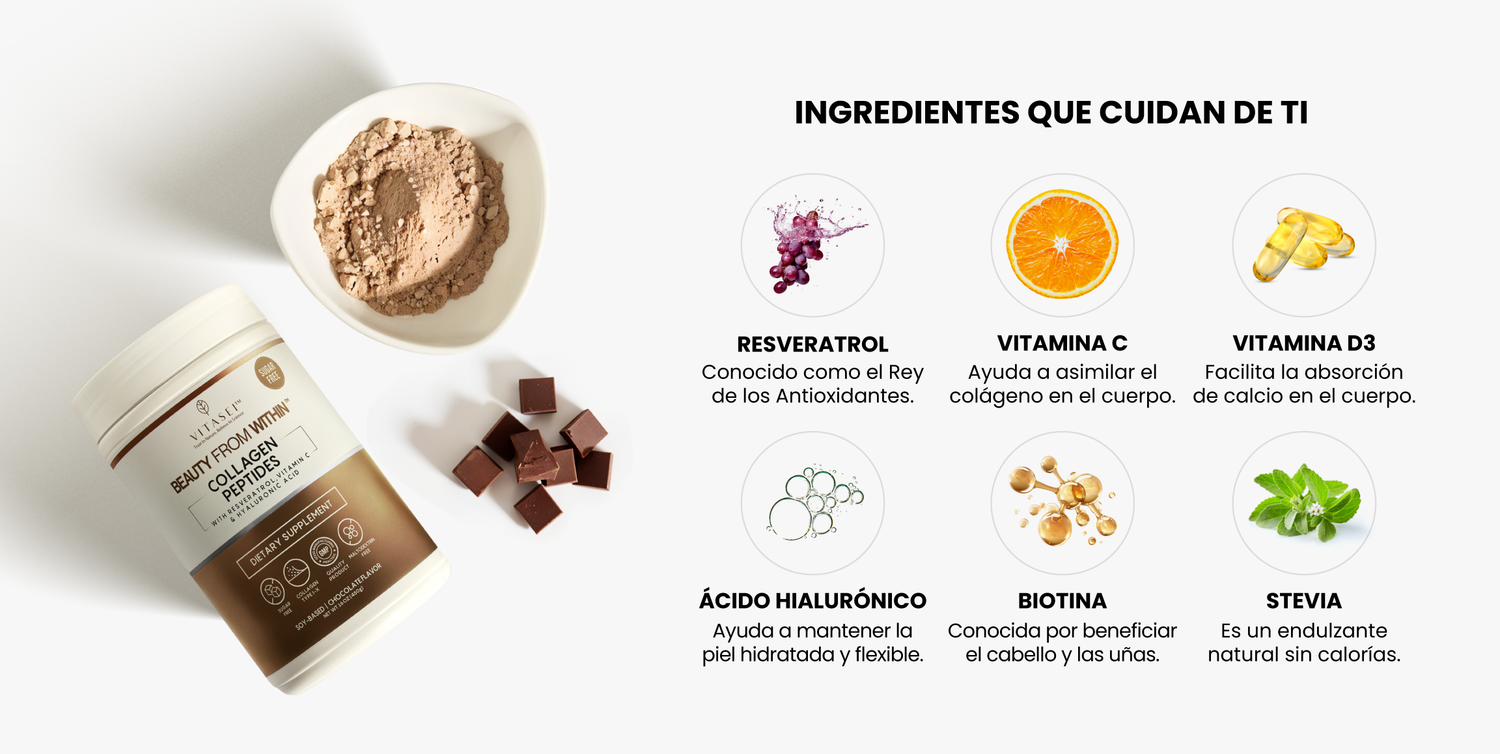Nuestra fórmula con 5 tipos de colágeno (I-X) está enriquecida con Resveratrol, Ácido Hialurónico, Biotina y Vitamina C, poderosos ingredientes que apoyan tu belleza y bienestar. Ahora con una fuente de proteína a base de soya.**