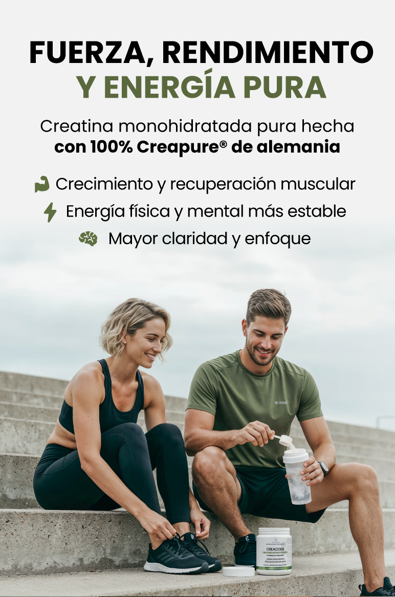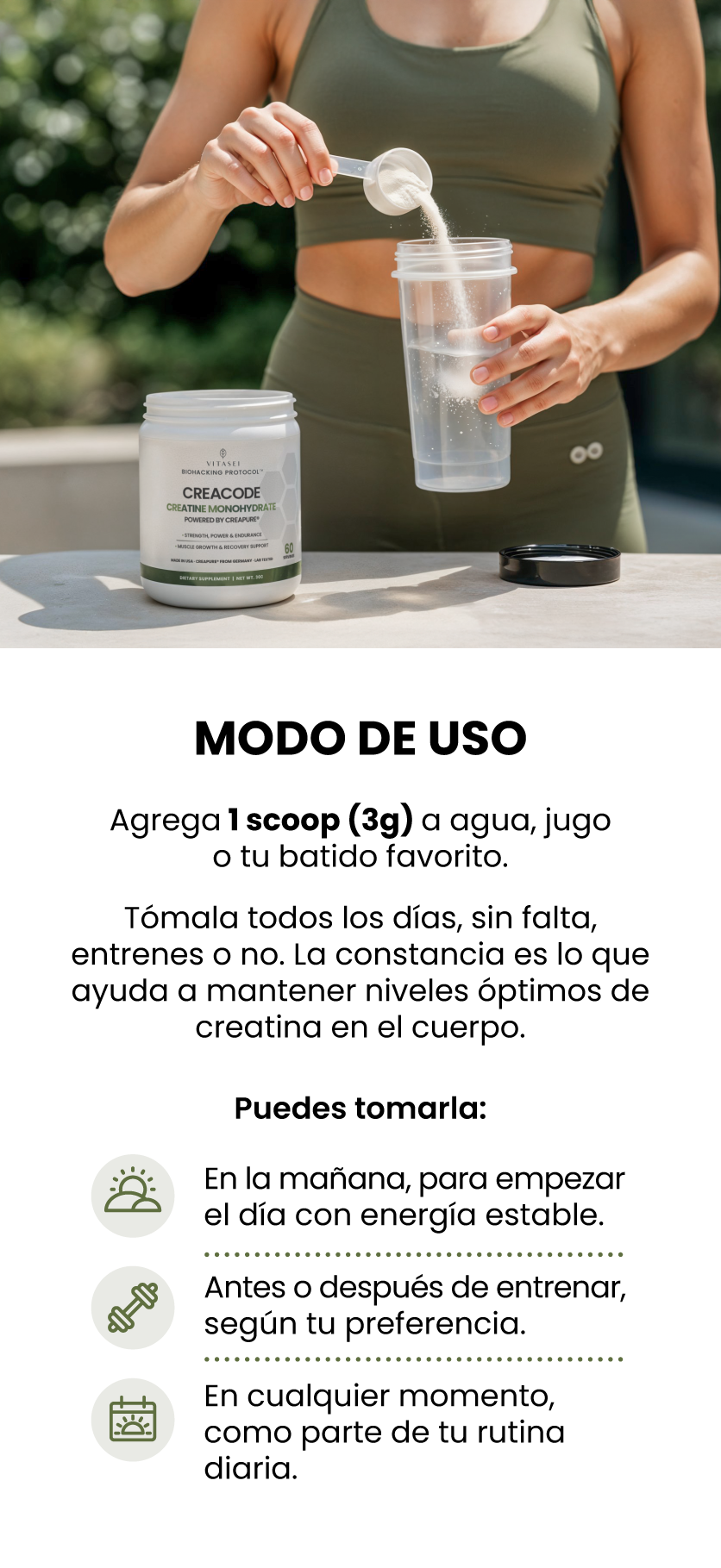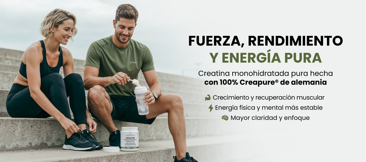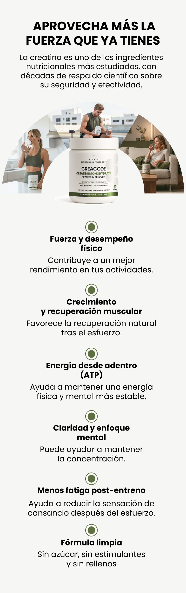 CREACODE tiene Creapure® fabricada en Alemania, verificada en EE.UU. Cada toma es exactamente lo que dice la etiqueta. Sin rellenos, sin ingredientes escondidos.