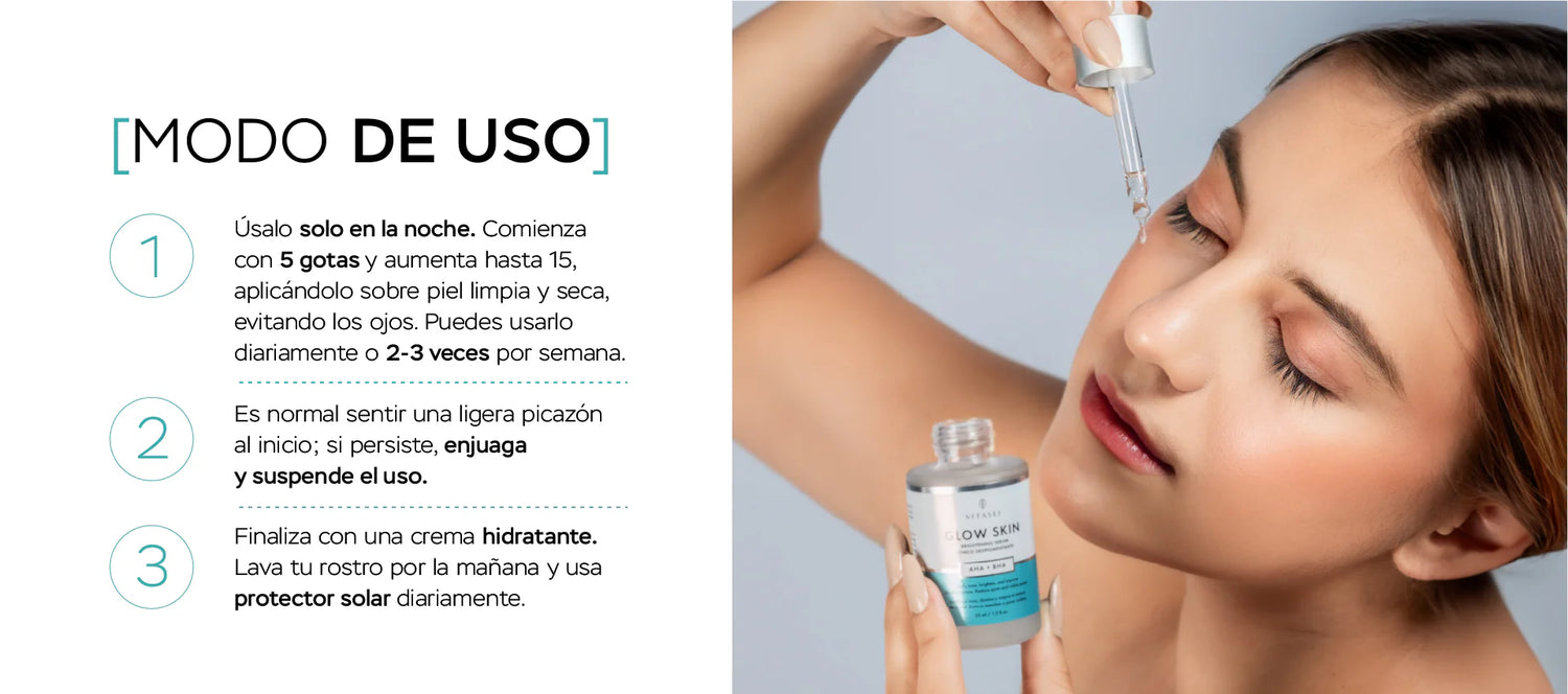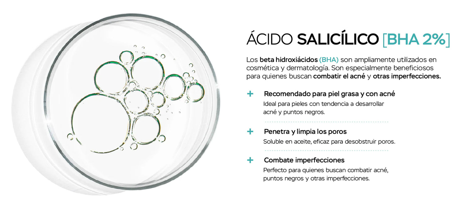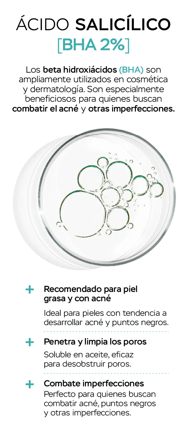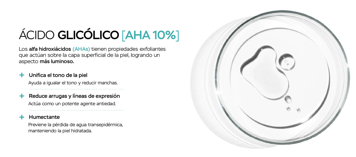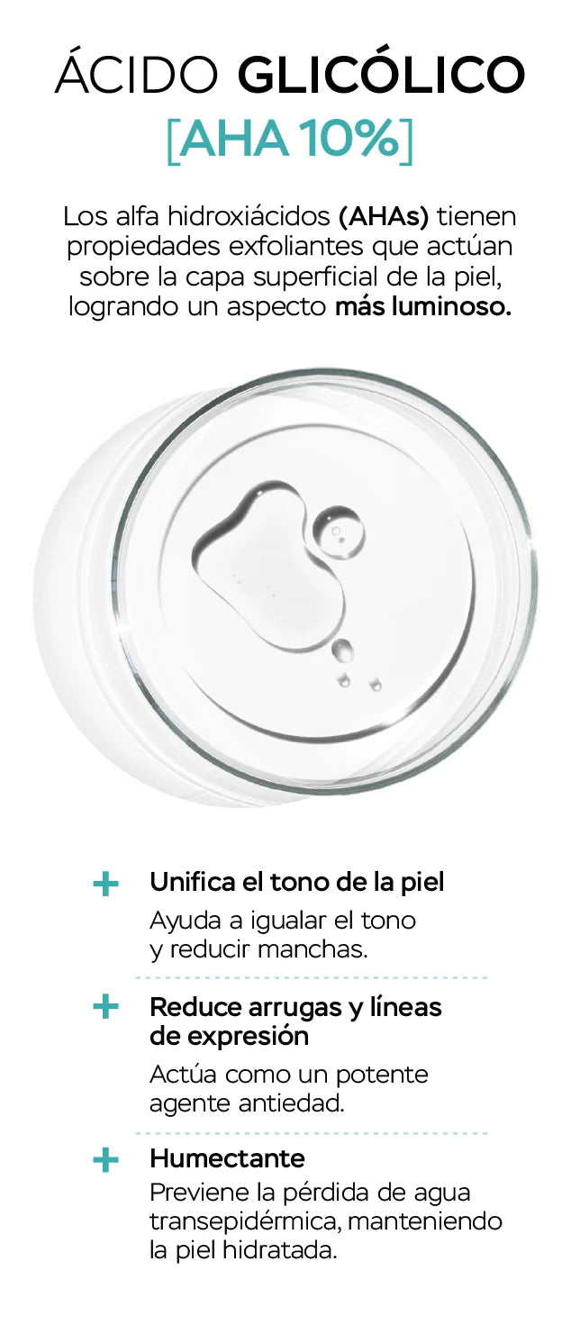 Fórmula con Ácido Glicólico (AHA), Salicílico (BHA), Azelaico, Arbutina y Vitamina C.†