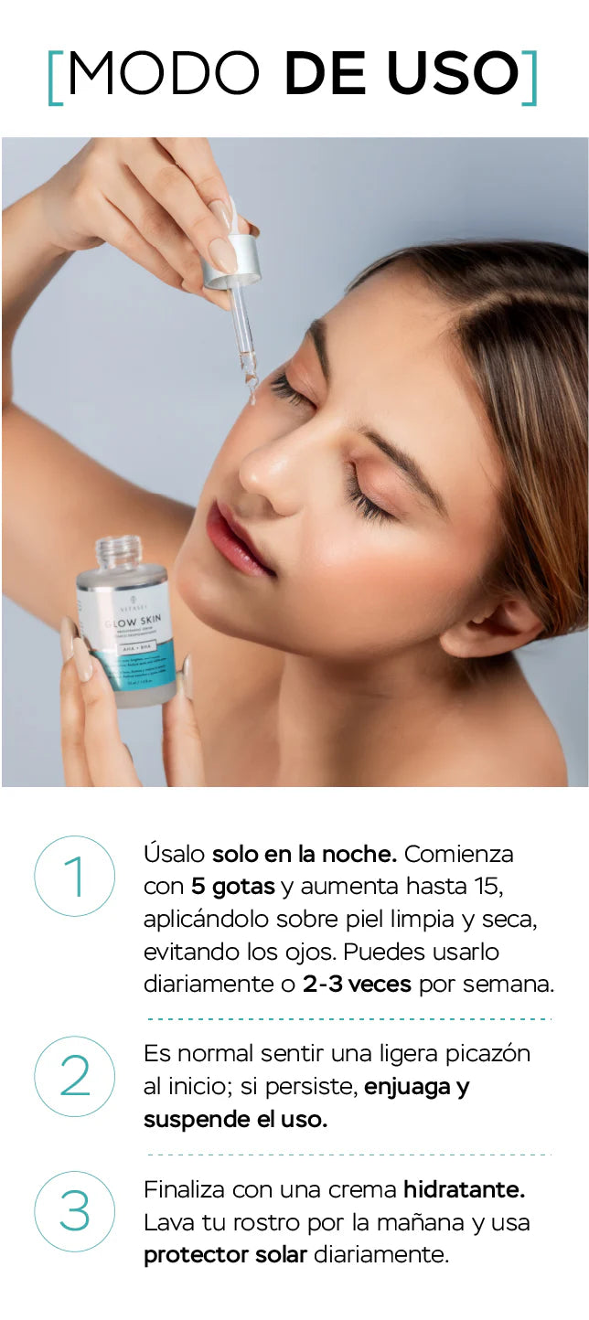 Gracias a su concentración de ácidos AHA (alfahidroxiácidos) y BHA (betahidroxiácidos) unifica el tono, ilumina y mejora la textura de la piel.†