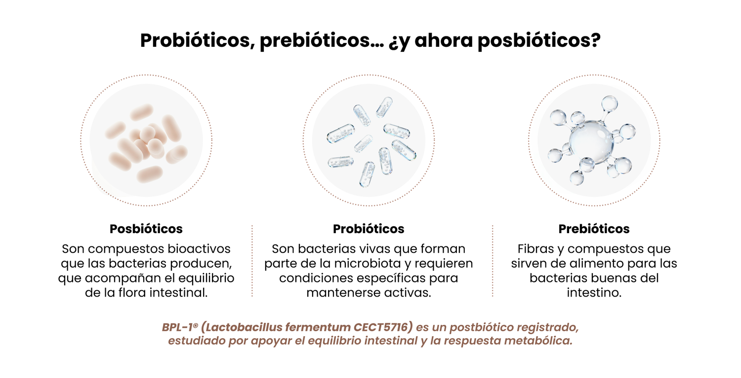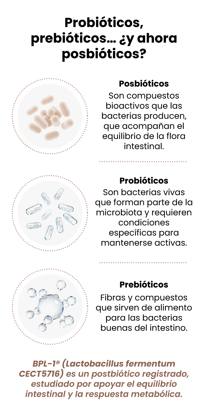 Los probióticos son bacterias vivas. Los postbióticos son compuestos bioactivos producidos por bacterias a través de la fermentación. No necesitan estar vivos para apoyar tu intestino. Son más estables, más fáciles de almacenar y no dependen de sobrevivir al ácido del estómago para ser efectivos.