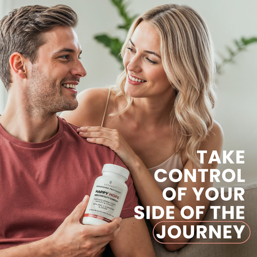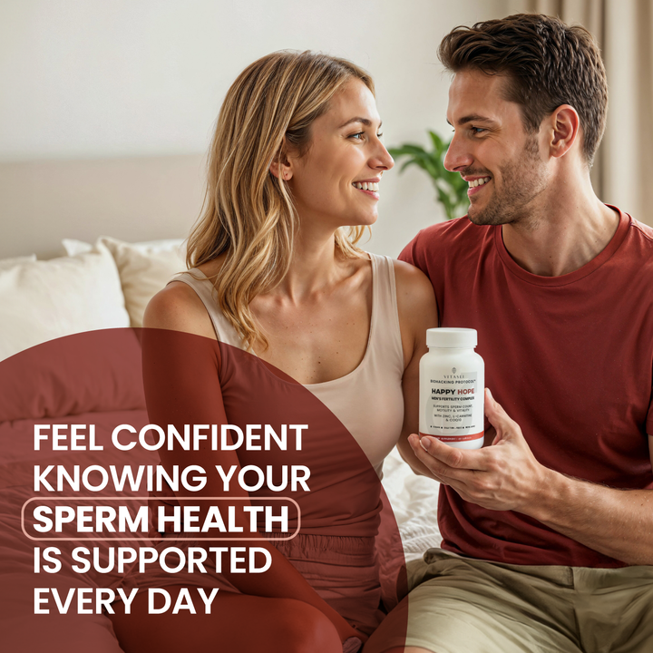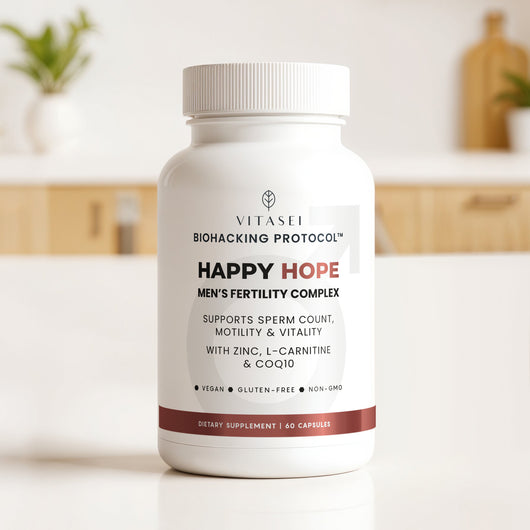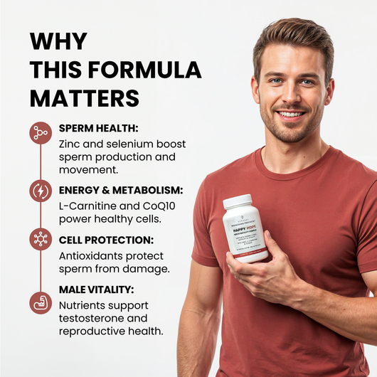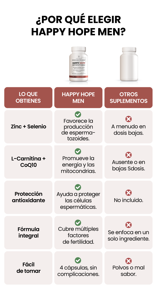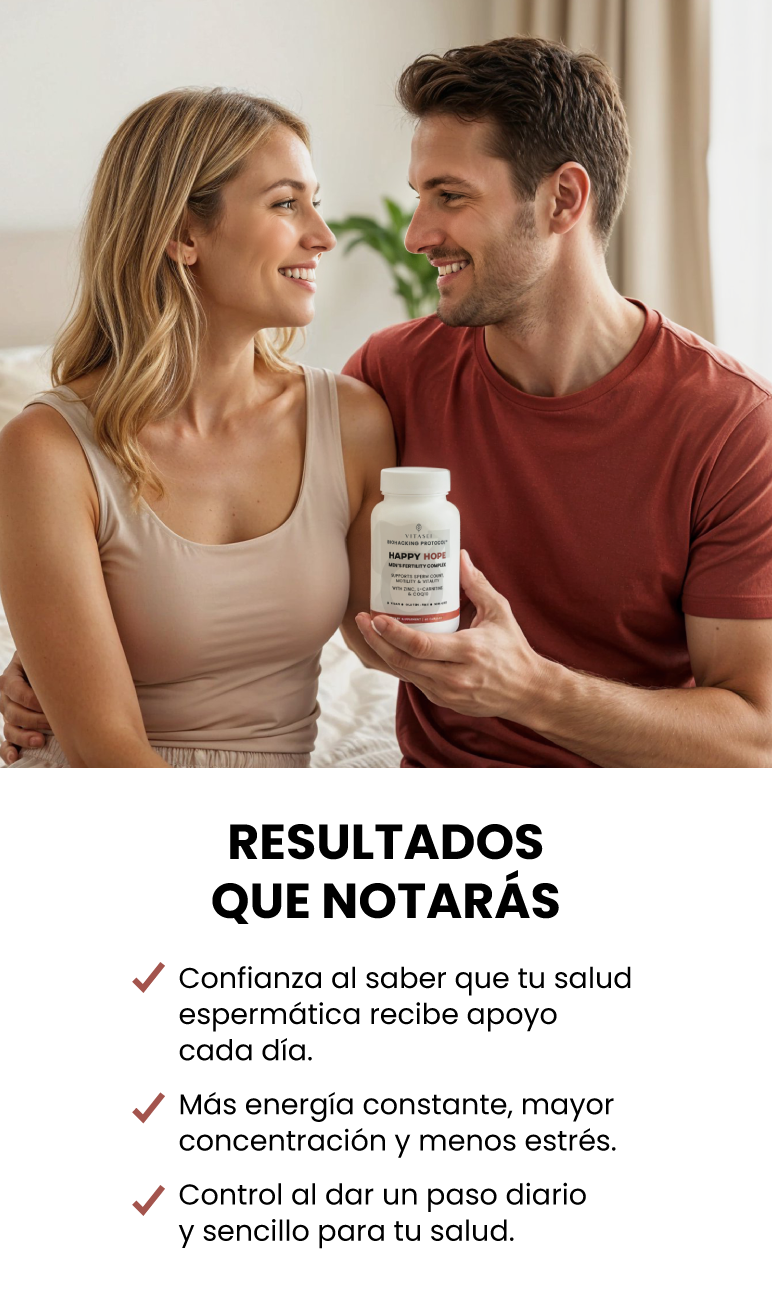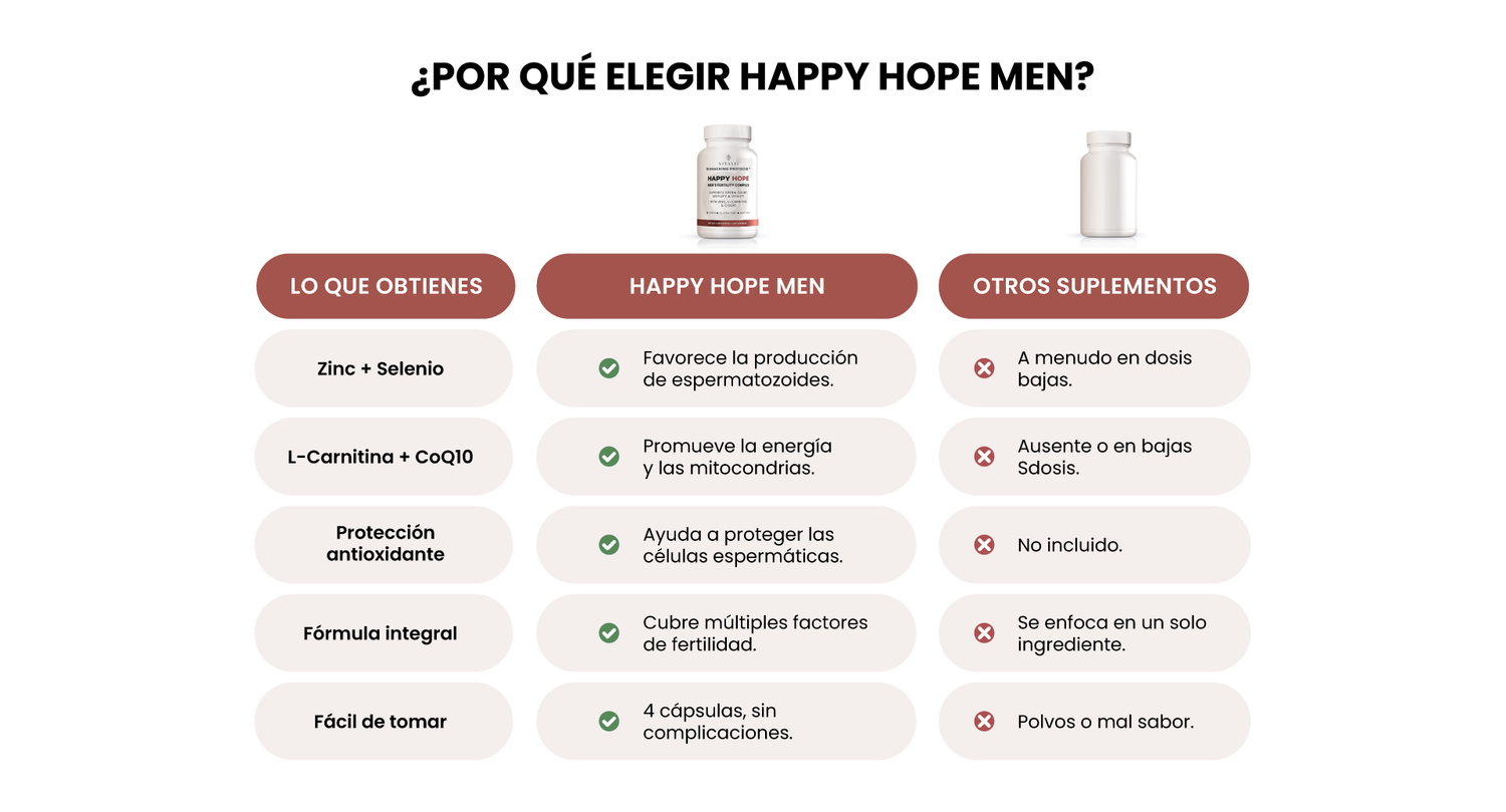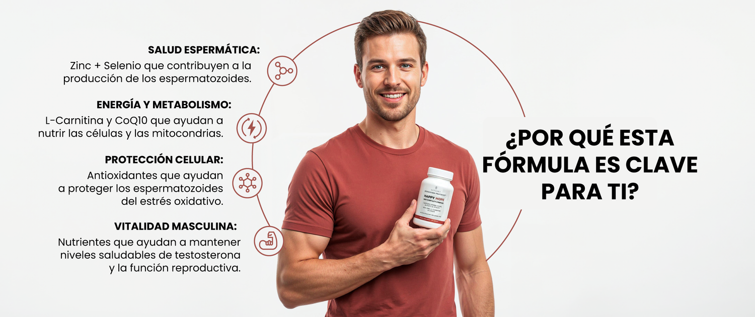 Happy Hope combina Zinc, L-Carnitina y CoQ10, nutrientes que contribuyen al equilibrio hormonal, la producción y movilidad de los espermatozoides, además de proteger las células del estrés oxidativo.