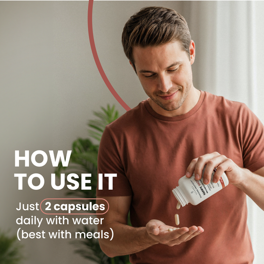 Toma 2 cápsulas al día con agua, preferiblemente junto con una comida.