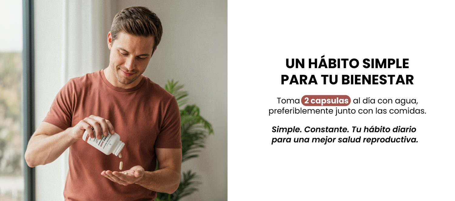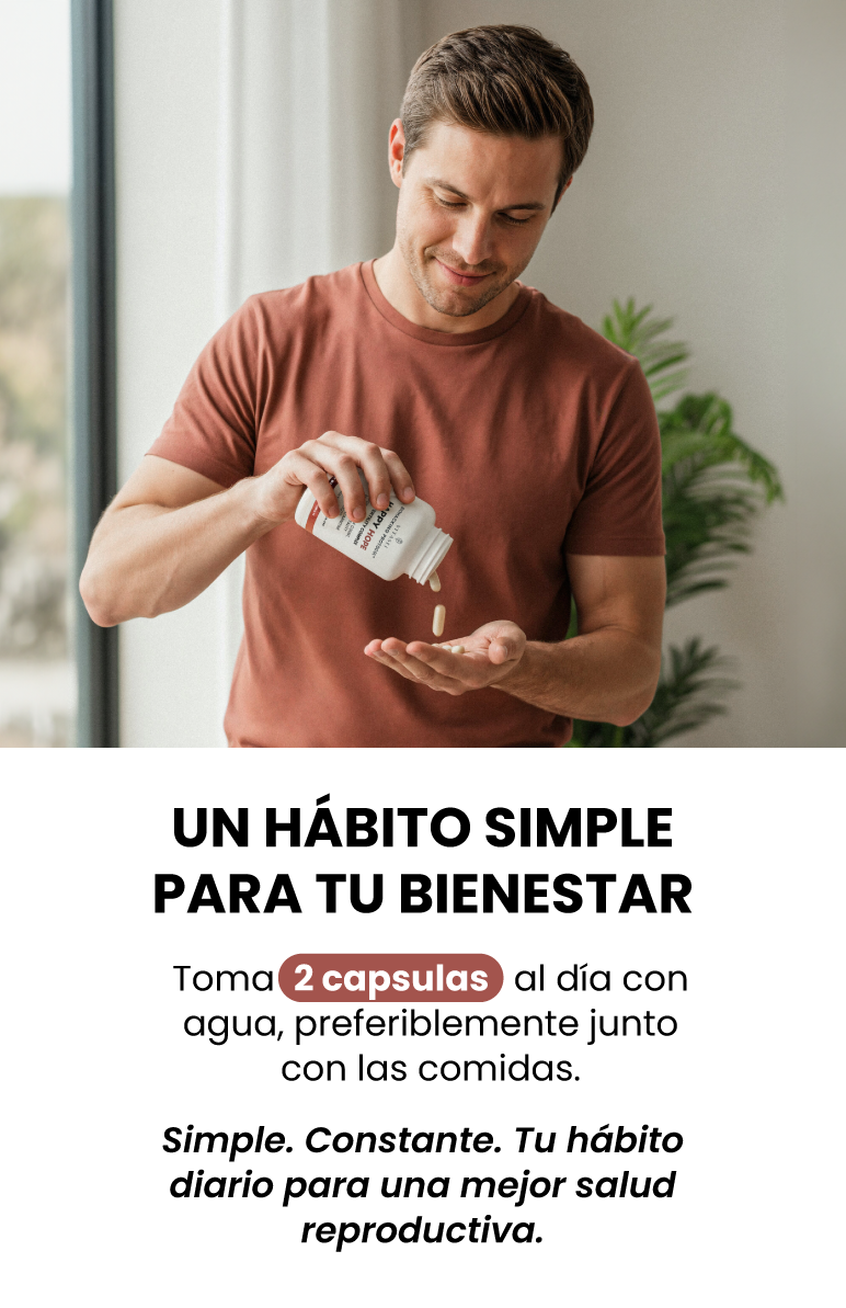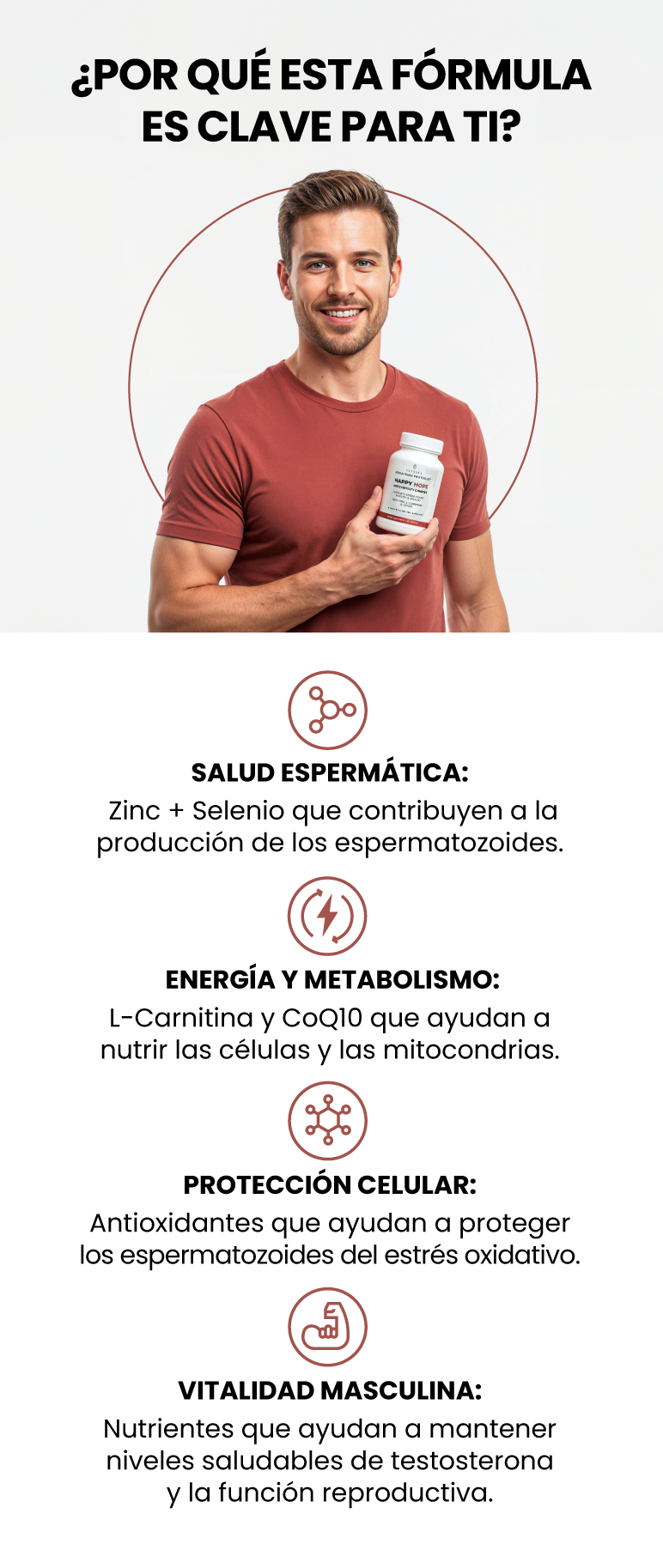 No es un suplemento más. Su fórmula combina Zinc, L-Carnitina y CoQ10, nutrientes esenciales que trabajan en conjunto para favorecer la vitalidad masculina, la energía y el bienestar reproductivo desde adentro.