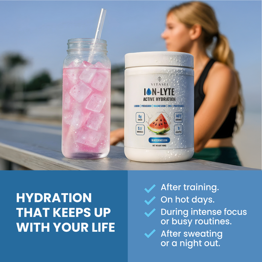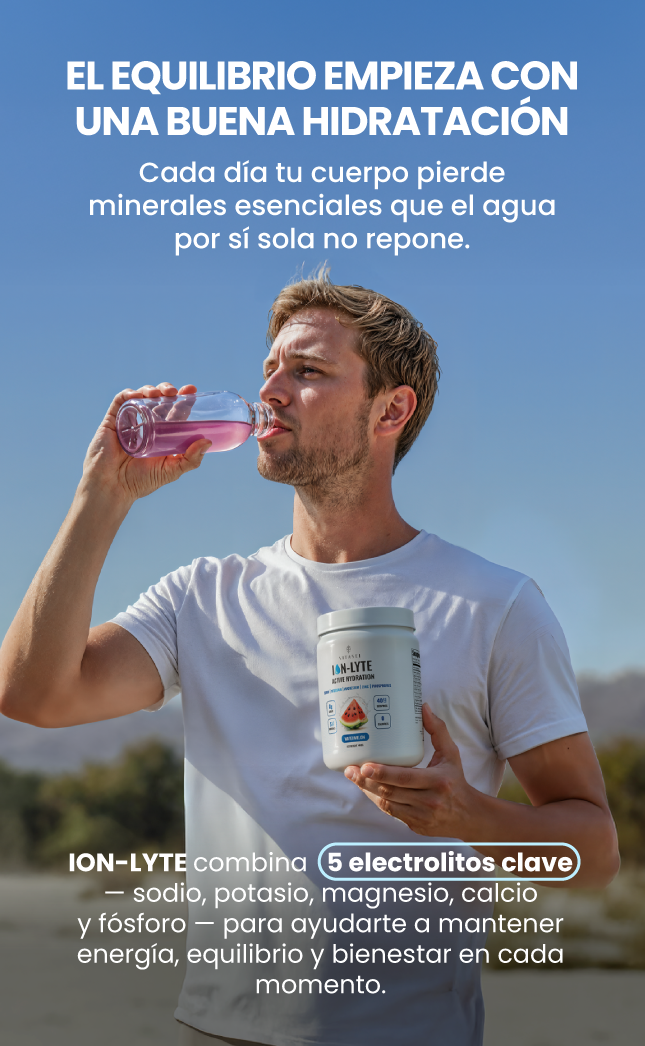 ION-LYTE Active Hydration es tu solución definitiva cuando el agua normal no es suficiente. Contiene 5 electrolitos esenciales —sodio, potasio, magnesio, calcio y cloruro.