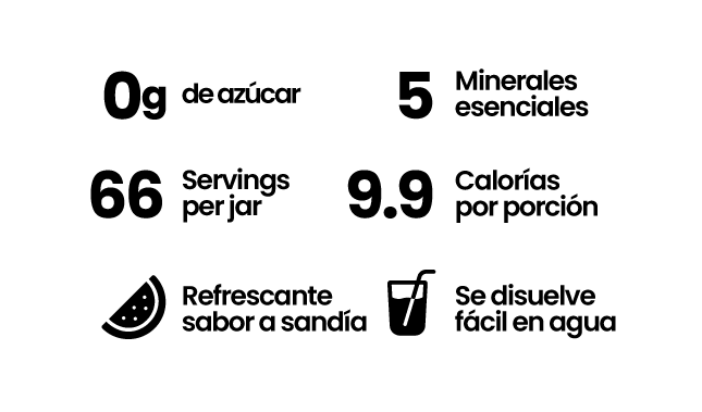 Sin azúcar. Sin cosas artificiales. Sin sabor raro. Solo 5 minerales clave — sodio, potasio, magnesio, calcio y fósforo — con un sabor a sandía ligero y realmente rico.