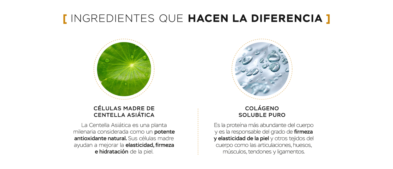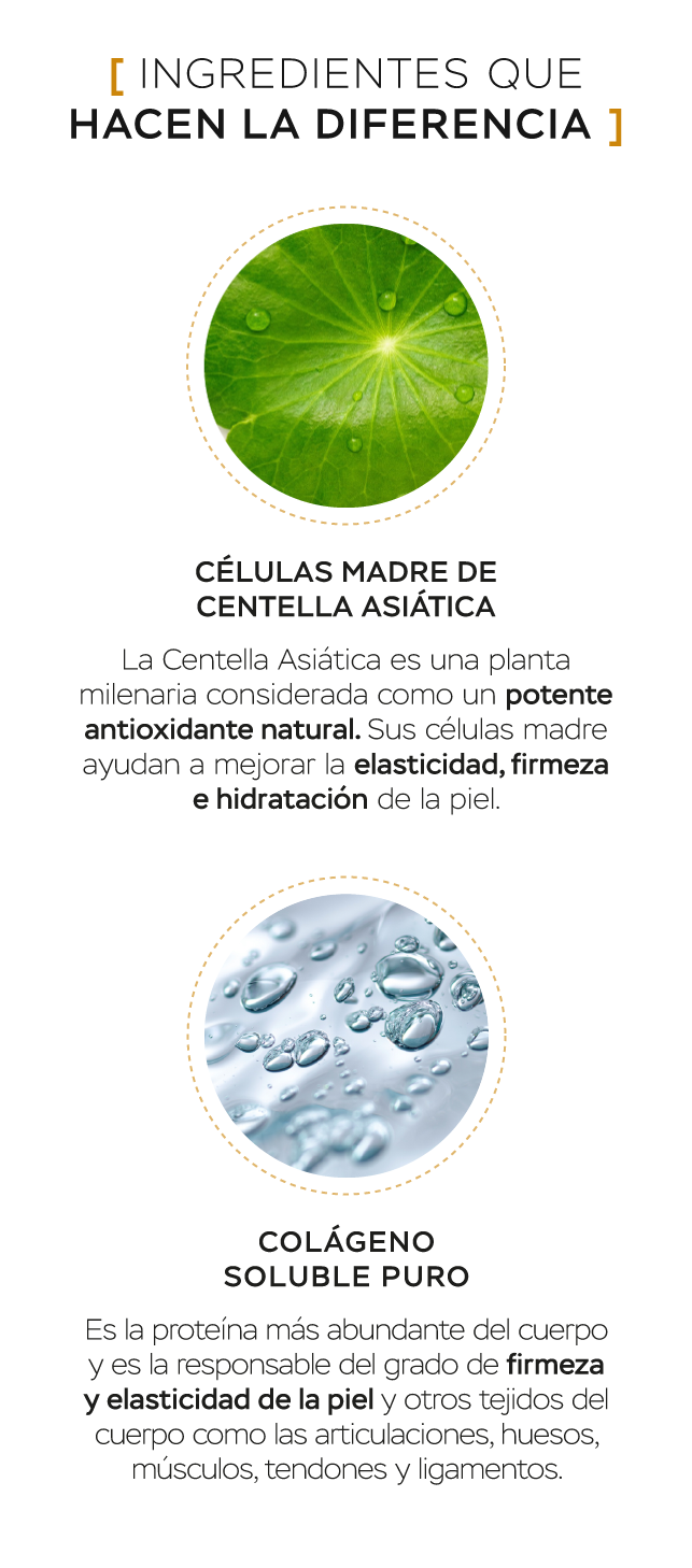 - Gracias a la centella asiática, mejora la elasticidad, firmeza e hidratación de la piel.†