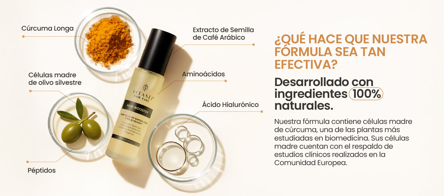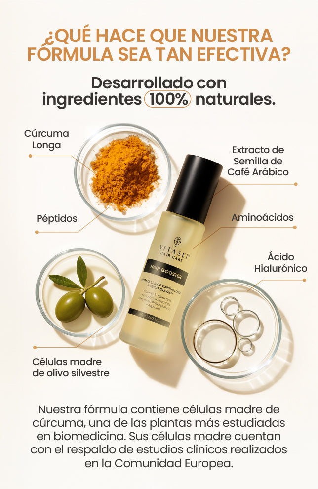 Potenciador Capilar con una fórmula innovadora que combina el poder de células madre de cúrcuma, biotecnología de péptidos, arginina, extracto de café, ácido hialurónico y factores de crecimiento.