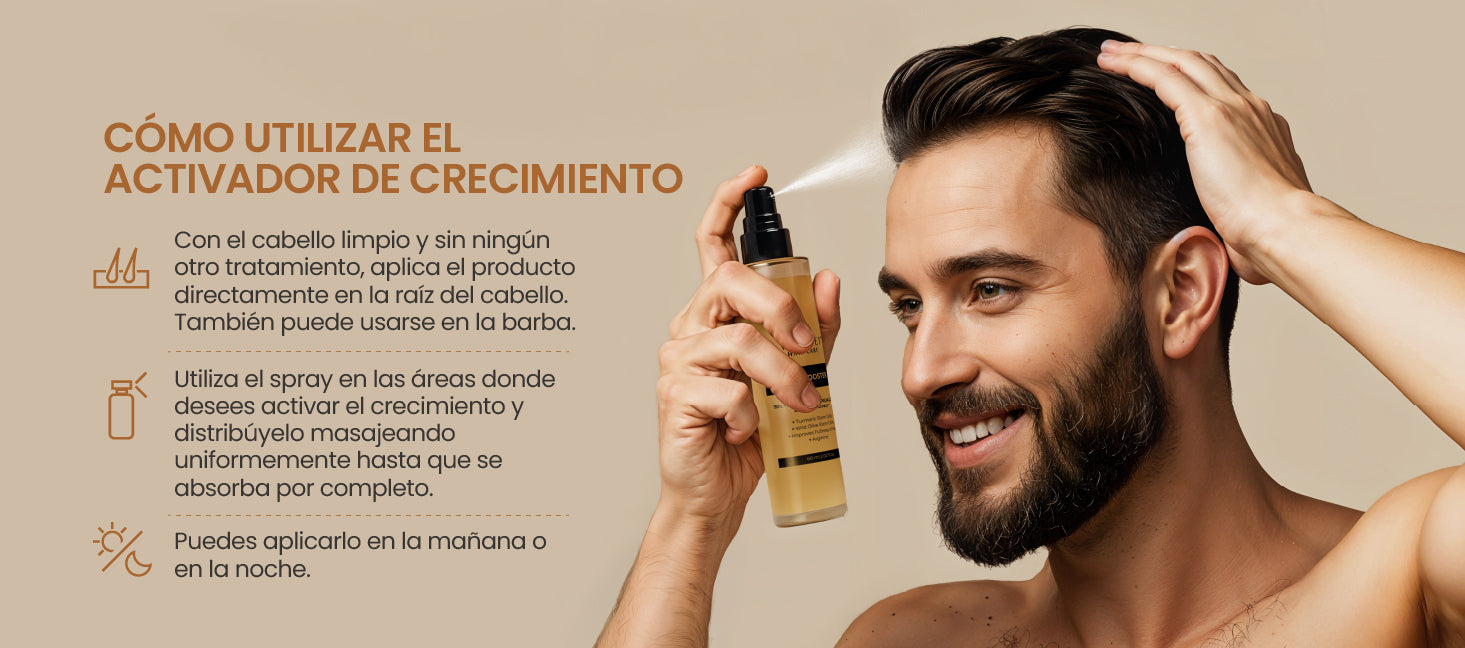 Para usarlo de manera efectiva, aplique el activador sobre la raíz del cabello limpio y sin tratamientos. Luego, distribuya el producto masajeando en forma circular hasta que se haya absorbido por completo.