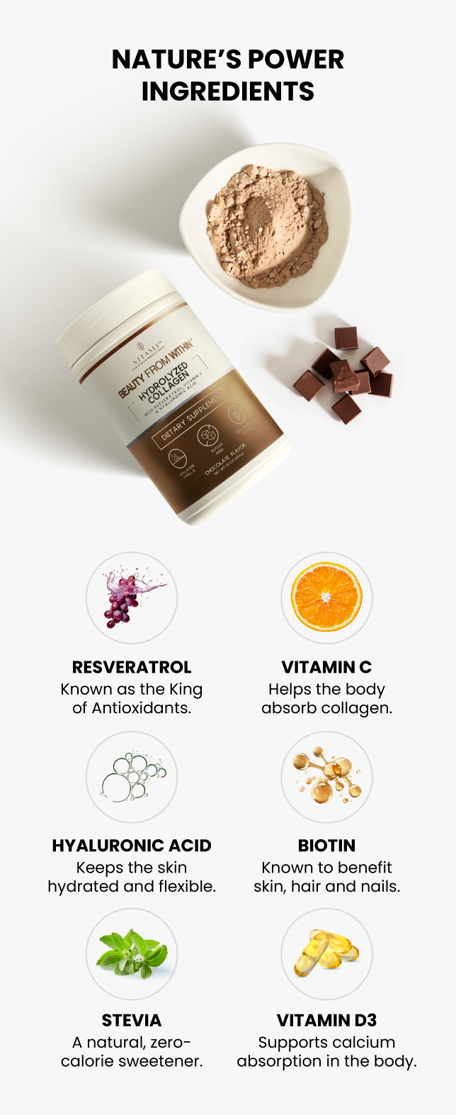Our formula with 5 types of collagen (I-X) is enriched with Resveratrol, Hyaluronic Acid, Biotin, and Vitamin C—key ingredients for your beauty and well-being.**