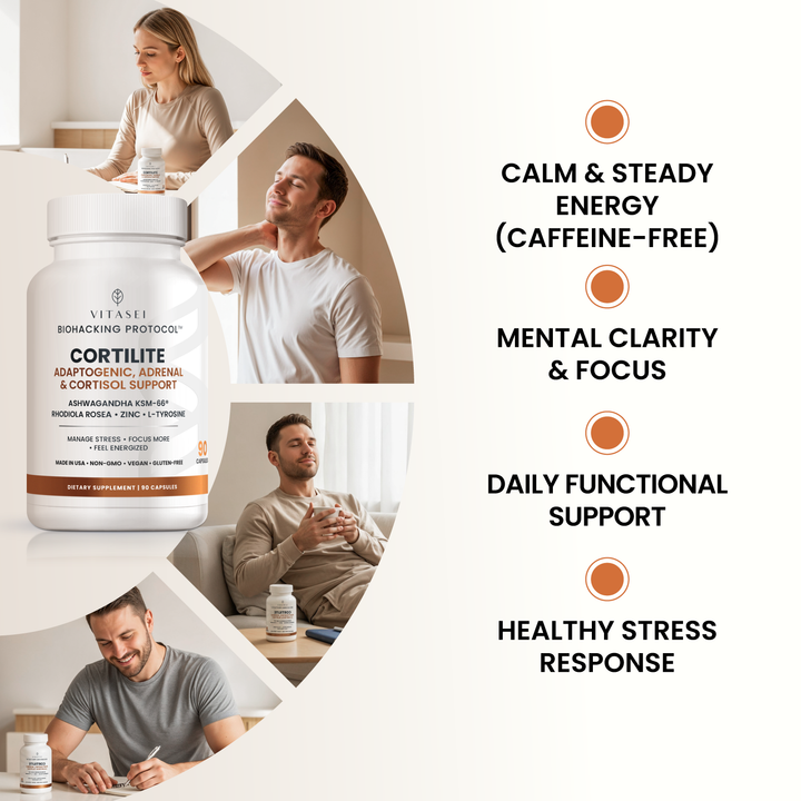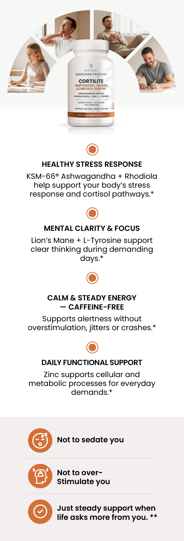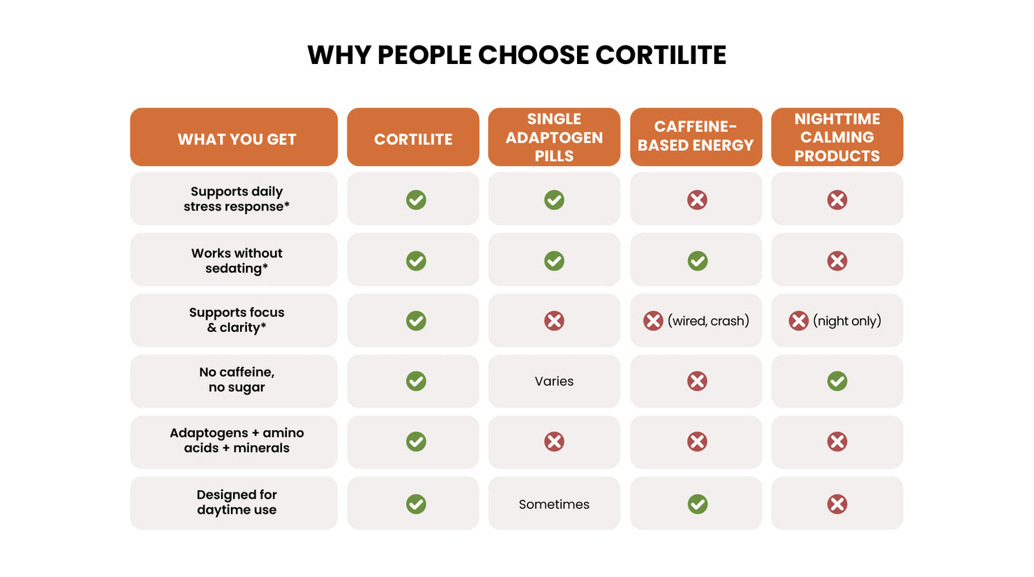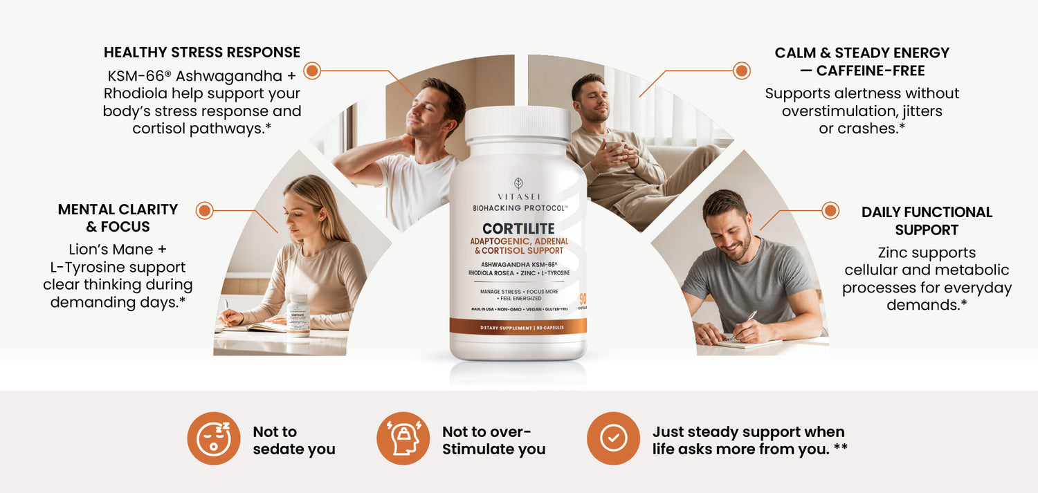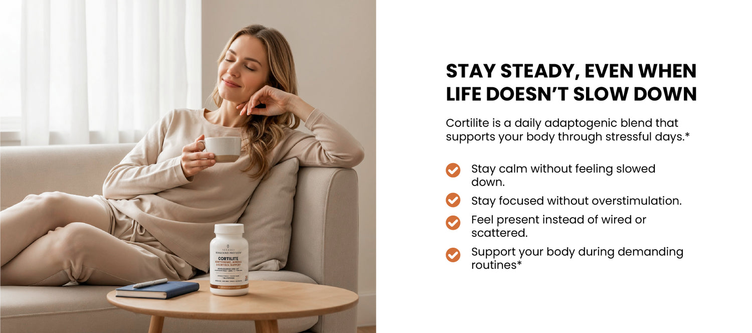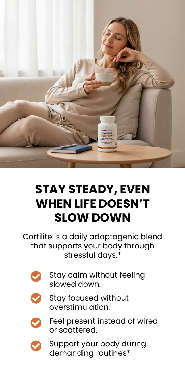 Cortilite blends adaptogens like Ashwagandha KSM-66® and Rhodiola to help you move through busy days feeling more grounded and clear-minded.