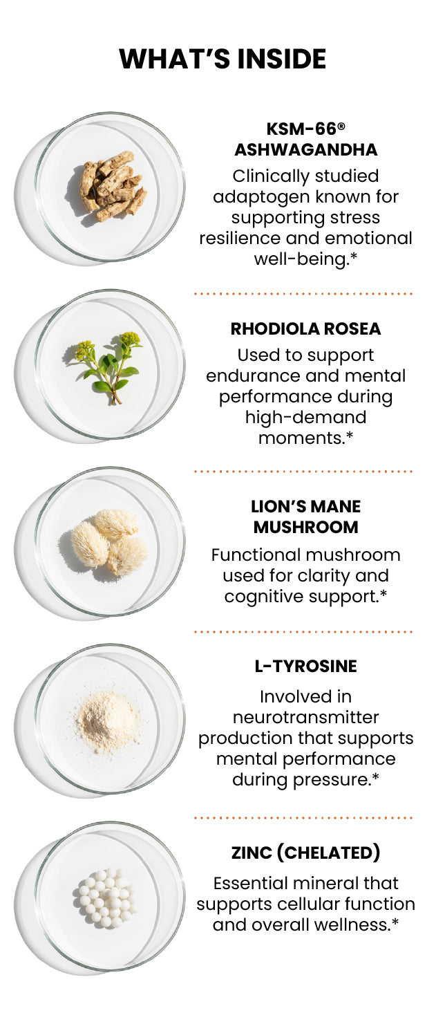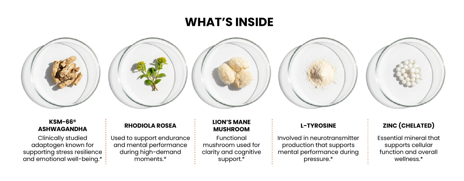 - KSM-66® ashwagandha – known to support stress resilience and a calm mind