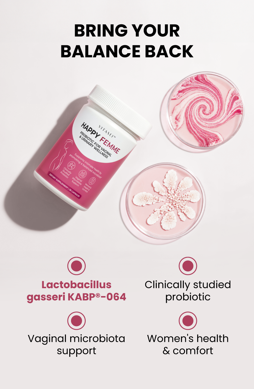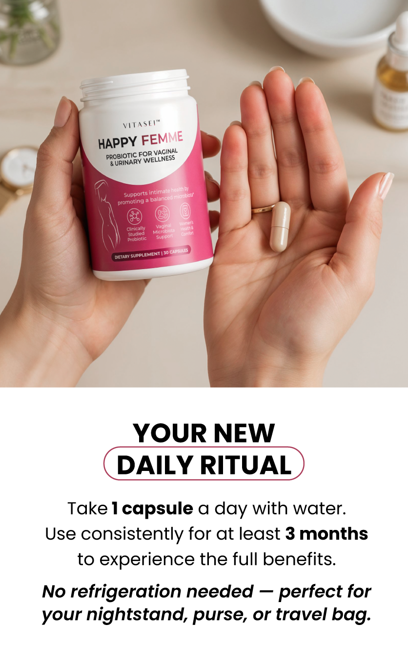 Happy Femme is a daily probiotic made for women who want to feel balanced and comfortable every day. It works from within with clinically studied Lactobacillus strains that help care for your intimate wellness naturally.