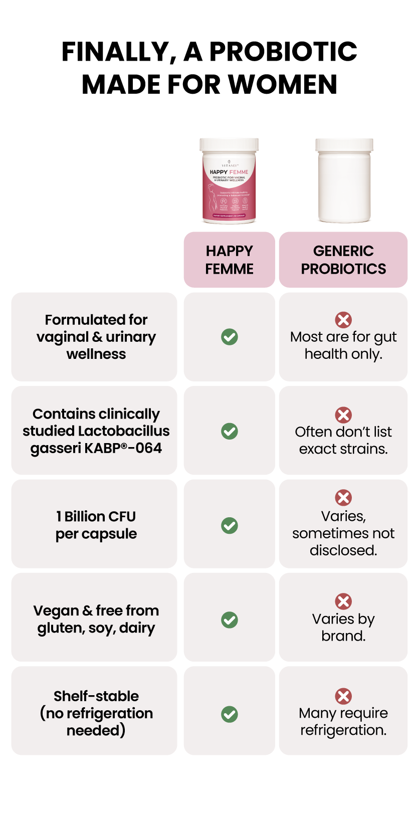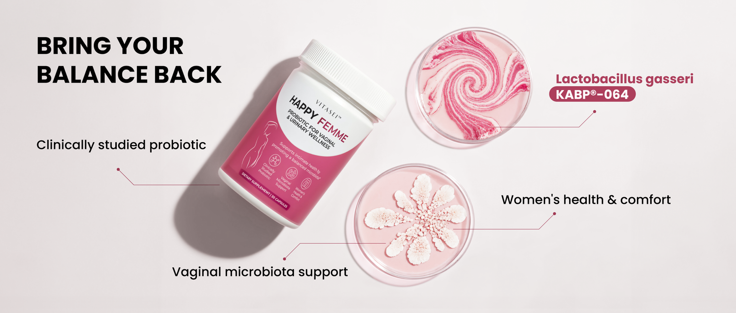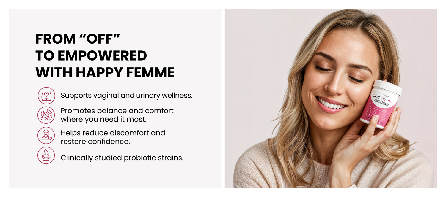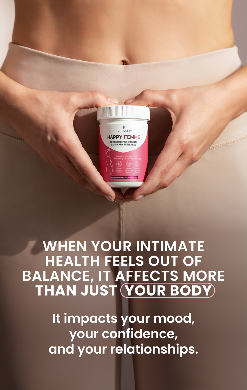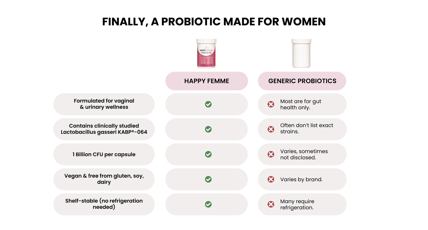 That’s why we created Happy Femme, a probiotic specially designed to support women’s vaginal and urinary health.