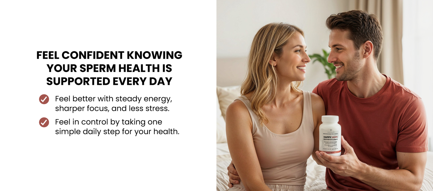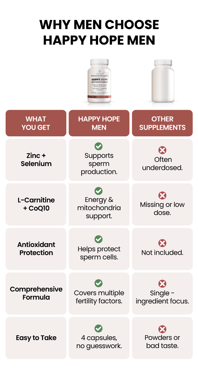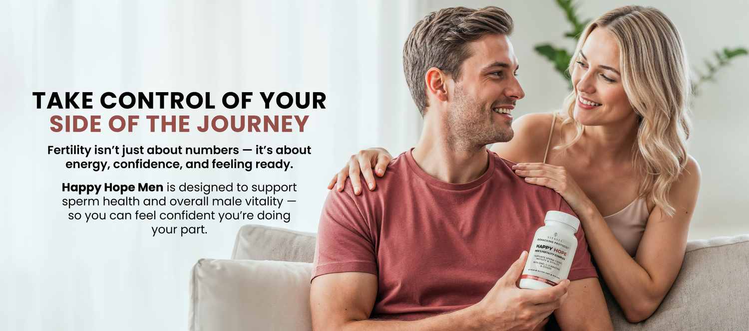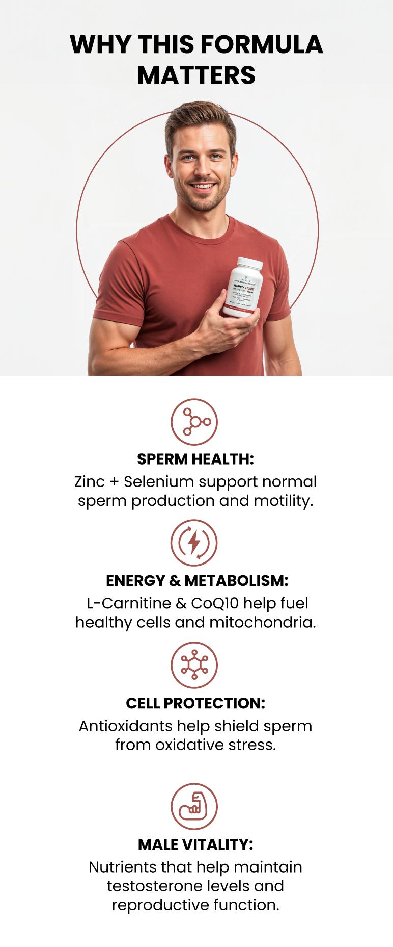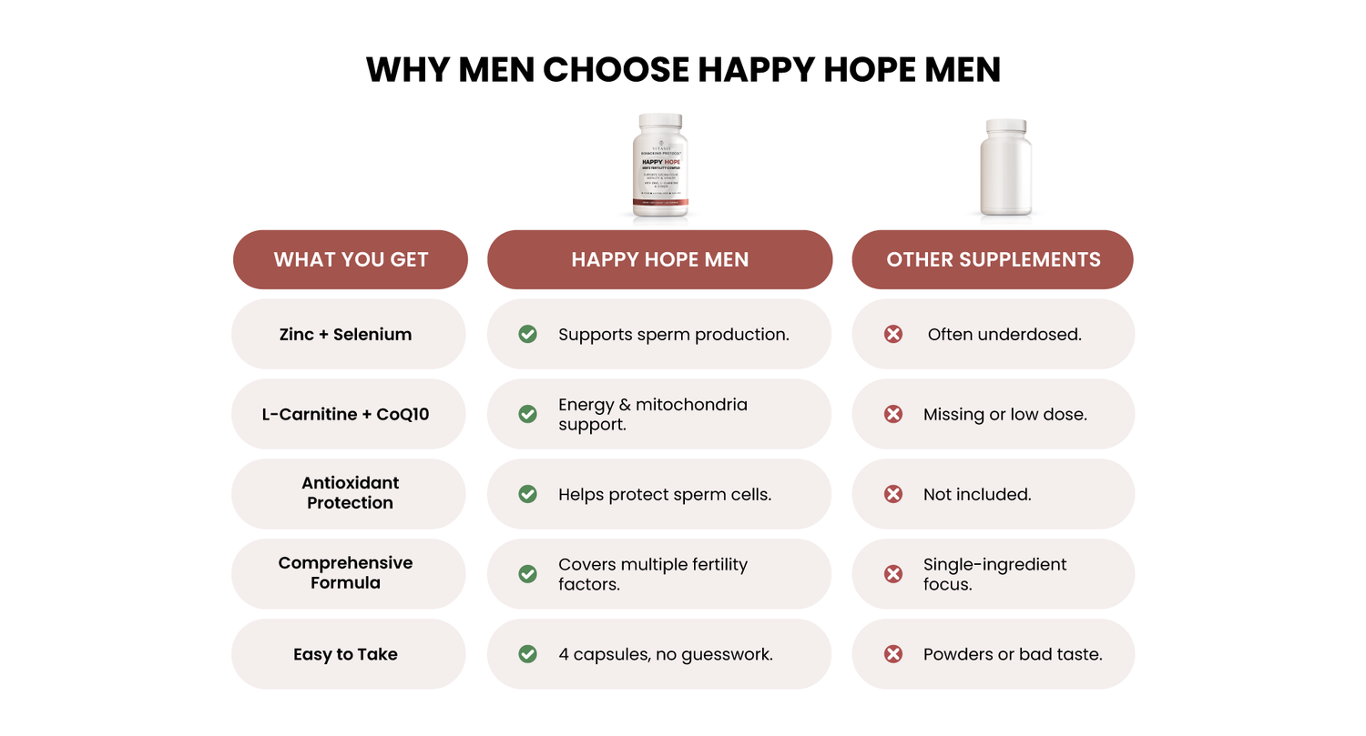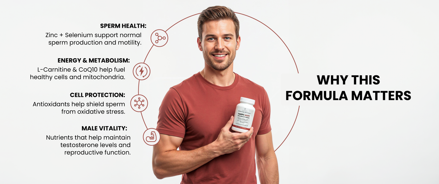 Happy Hope Men combines Zinc, L-Carnitine, and CoQ10 to support sperm health, energy, and vitality.