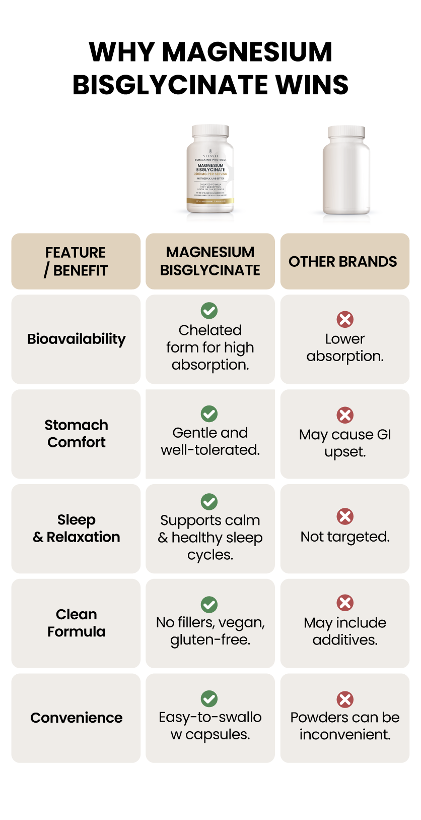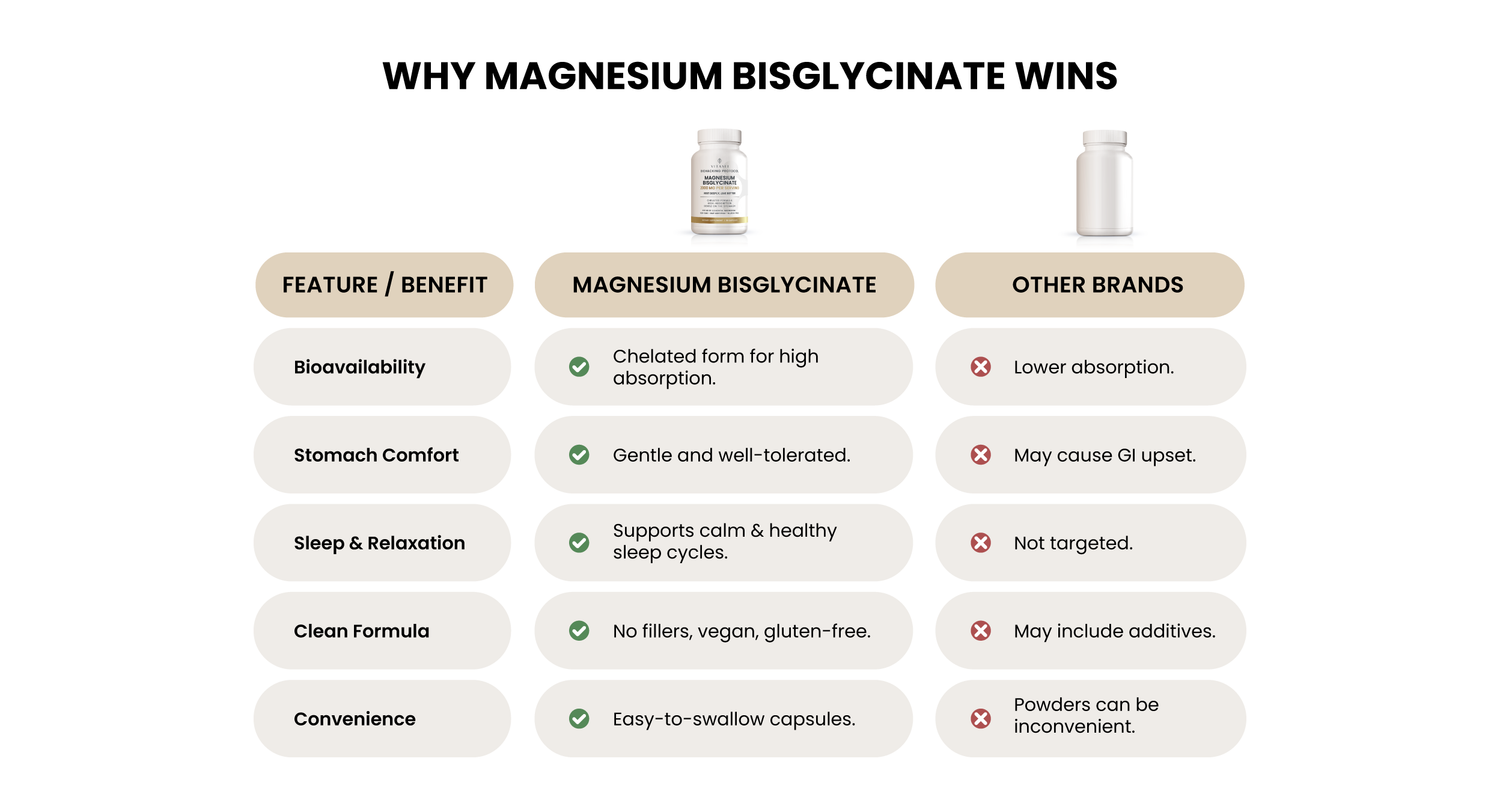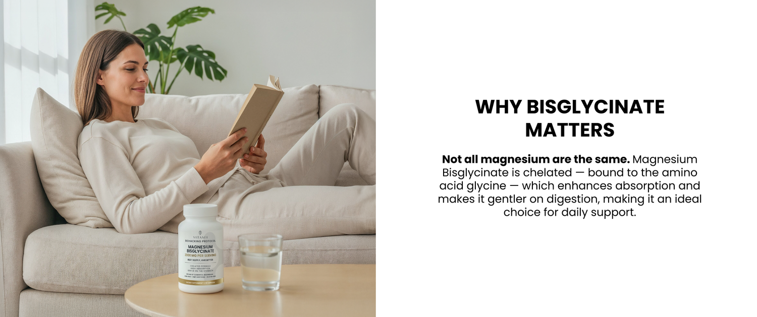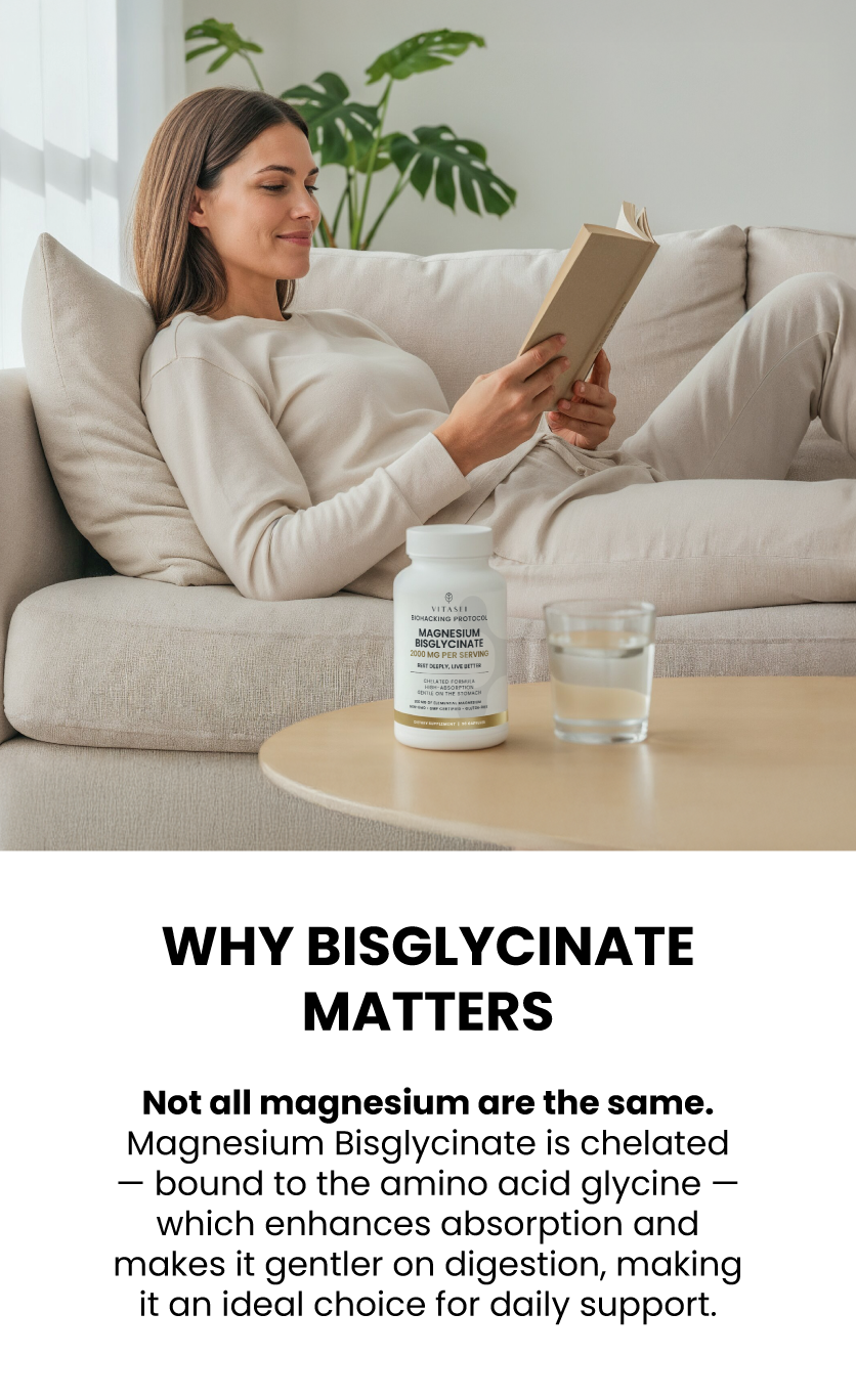 Not all magnesium is the same. Bisglycinate is chelated, meaning it binds to the amino acid glycine, which makes it highly bioavailable and easier on your stomach—so your body actually gets to use it.