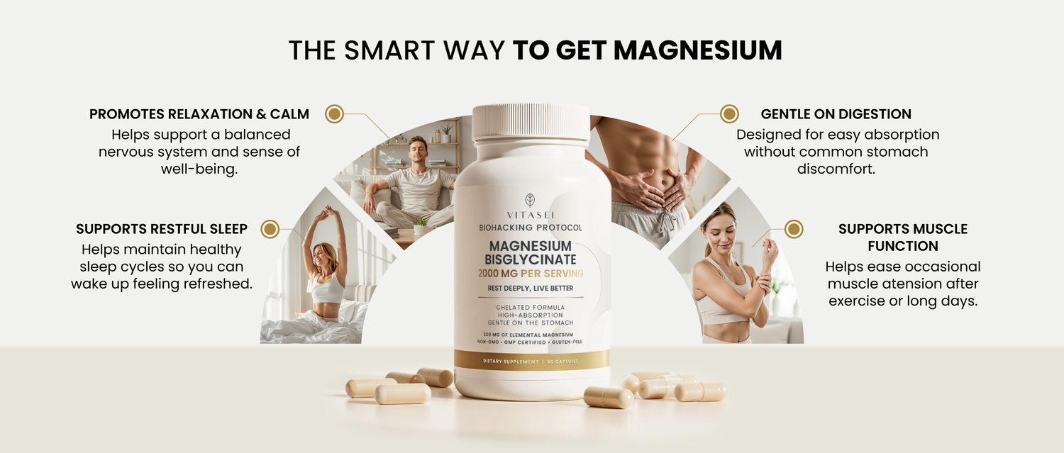 Leafy greens, nuts, and seeds are great sources—but most people still don’t get enough through diet alone. Magnesium bisglycinate helps fill that gap in a reliable, easy-to-take way.