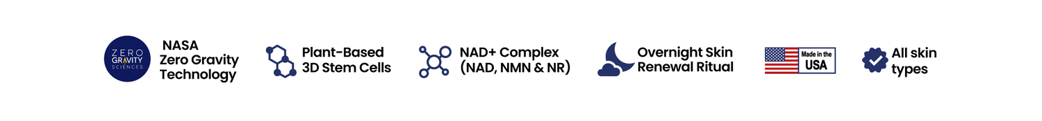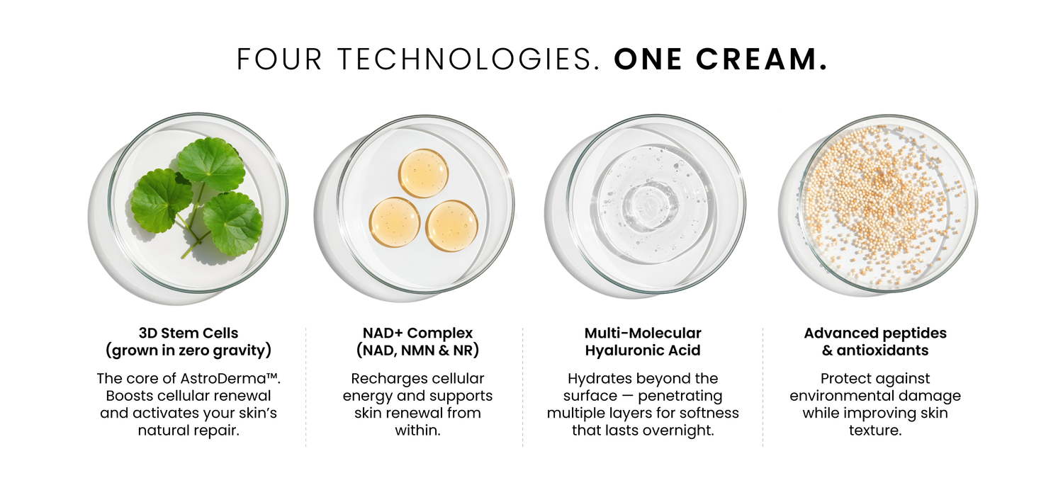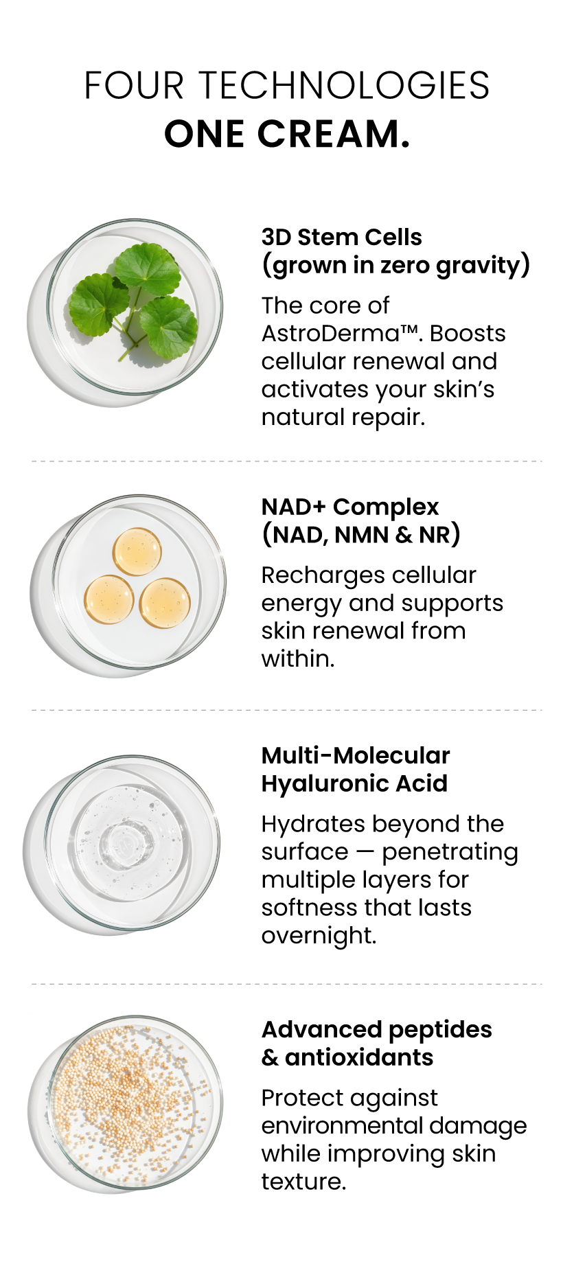 Four serious technologies: 3D Stem Cell Complex for cellular renewal, NAD+ Complex (NAD, NMN & NR) to recharge skin at a cellular level, Multi-Molecular Hyaluronic Acid that hydrates at every layer, and advanced peptides + antioxidants that firm and protect overnight.