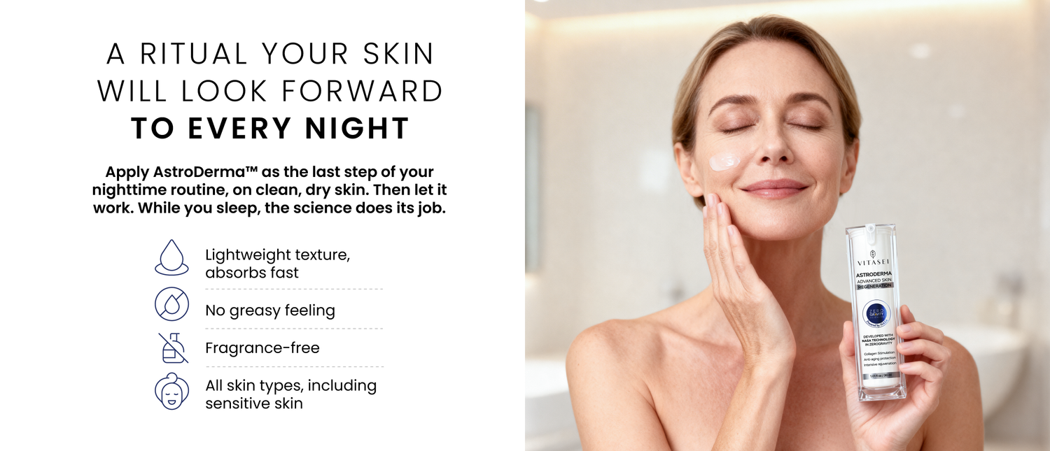 Night only. Your skin repairs itself while you sleep — AstroDerma™ is designed to work with that process. Apply it as the last step of your nighttime routine and let it work.